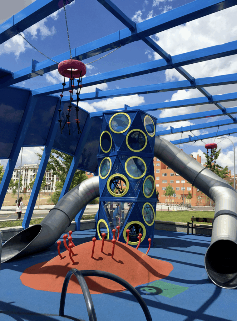 Un buen ejemplo de esta filosofía es el proyecto del Parque Marino situado en Fuentelucha, un espacio de juegos infantiles de 499 m² con una temática marina vibrante. Diseñado para que los niños puedan jugar e imaginar libremente, este parque destaca por sus estructuras metálicas de colores vivos y atractivos, constantemente expuestas a las condiciones climáticas y a un uso intensivo.